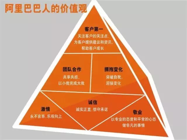 升級后的價(jià)值觀取材于“阿里土話”,是非常阿里式的話語表達(dá)體系。用一位阿里的HR的話來說,“阿里的這六條價(jià)值觀,一聽就是阿里的,辨識度非常高”。