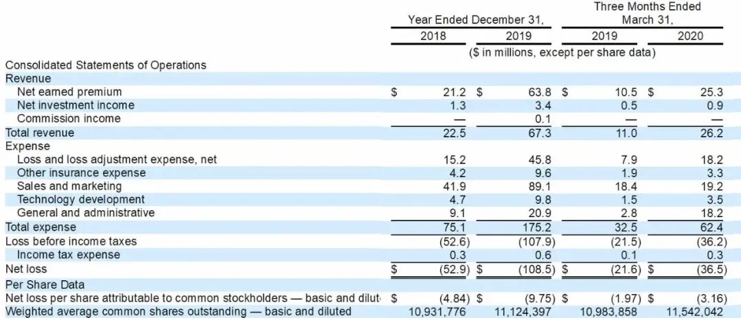 Lemonade在2018年、2019年凈虧損分別為5290萬美元、1.085億美元;Lemonade在2020年第一季度凈虧損為3650萬美元,上年同期凈虧損為2160萬美元。